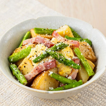 山口県産アスパラの彩りと食感を楽しむカップデリ。地元の新鮮なアスパラを使用し、シャキっとした食感と鮮やかな色味が特長の商品です。アスパラの根本部分はすりおろしてタルタルソースに使用し、やわらかい穂先は、盛り付けに使用しています。