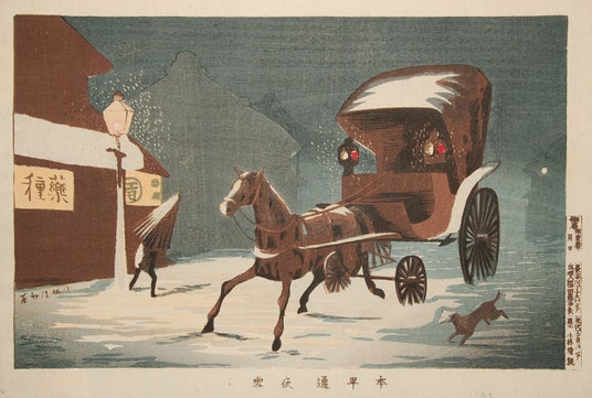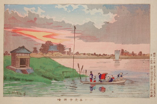 第4期で最も多くの作品が展示される小林清親は、光と影に強く関心を寄せた明治期を代表する絵師です。もともとは幕臣だった清親の作品には、江戸から東京へと変わってゆく町並みへの深い眼差しが感じられます。朝、夕、夜、晴天、雨上がりなど、時間や天気によって変わる風景の表情を捉えた清親の木版画は、江戸時代までの名所絵とはまた異なる情趣を備えています。