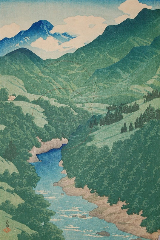 詩情豊かな風景版画を多く手掛けた川瀬巴水は、版元の渡邊庄三郎と共に伝統的な浮世絵木版技術による新たな木版画「新版画」の制作で知られます。同じく新版画の制作に取り組んだ画家、小原古邨の作品「柘榴と鸚鵡」では、羽の一枚一枚に絵の具をつけずに馬連で摺ることで凹凸を施す、浮世絵以来の「空摺り」の技法によって、無色の細かな凹凸が施されています。これらの作品では新版画の優れた木版技術を垣間見ることが出来ます。