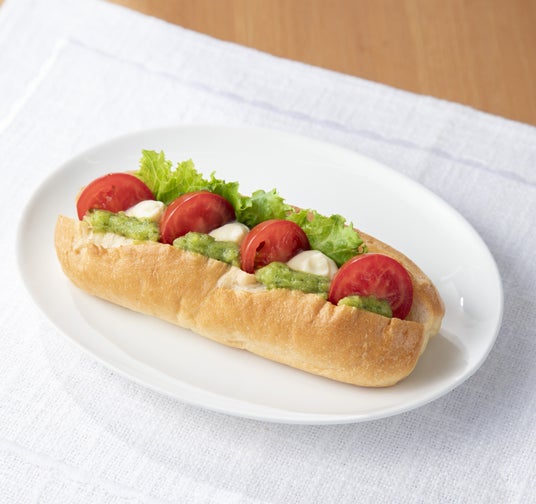 南相馬で栽培されているミニトマト「甘粒ルビー」を使用したカプレーゼ風のバゲットサンド。甘みが凝縮されたミニトマトとモッツァレラチーズソース、ジェノベーゼソースの組み合わせが絶品の味わい。
