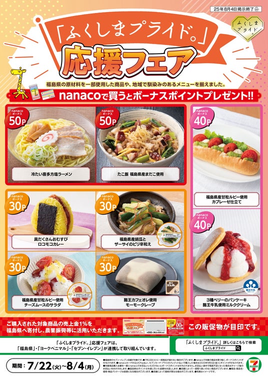 株式会社セブン‐イレブン・ジャパン(本社:東京都千代田区、代表取締役社長:阿久津 知洋)は、福島県の地産地消推進等の取り組みを支援する「ふくしまプライド。」応援フェアを7月22日(火)から8月4日(月)の14日間、福島県のセブン‐イレブンで開催いたします。