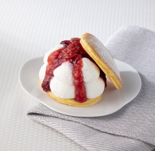 地域で親しまれている酪王牛乳をパン生地とミルククリームに使用した商品。ラズベリー、ストロベリー、ブルーベリーと3種のベリーソースをトッピングした夏でも食べやすいパンケーキ。華やかな見た目にもこだわったスイーツです。