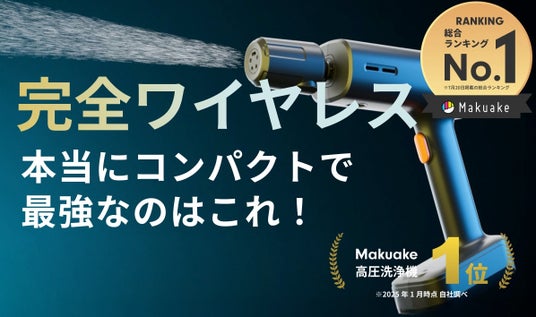 高圧洗浄機の概念を覆した、Makuake高圧洗浄機ランキング歴代1位の人気シリーズから登場!圧倒的洗浄力はそのままに、完全ワイヤレスで史上最小コンパクトサイズ