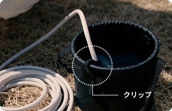 ワイヤレスで使用したい時はペットボトルで気軽に、長時間使用したい時は付属のホースと折りたたみ式バケツに簡単変更が可能です。