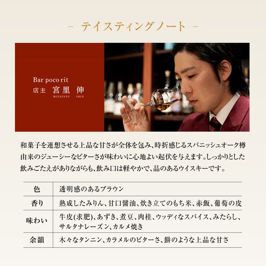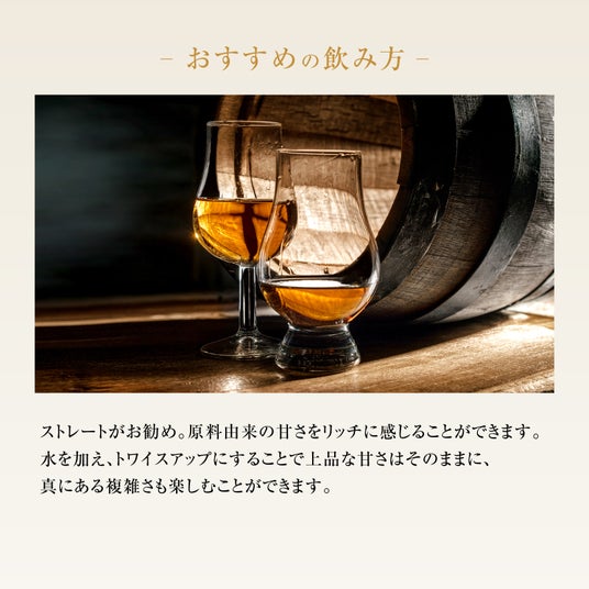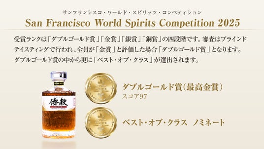 2025年に開催された世界的酒類コンペティション「SFWSC 2025(サンフランシスコ・ワールド・スピリッツ・コンペティション)」にて、全審査員が金賞と評した商品に与えられるダブルゴールドを受賞。さらに、ダブルゴールド受賞商品の中でも、ごく限られた数のみが選出されるベストオブクラス(Best of Class)のファイナリストにも選出されました。世界に認められた 日本米ウイスキーの味わいを、ぜひご堪能ください。