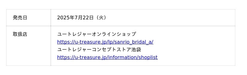 株式会社ユートレジャー(本社:東京都新宿区、代表取締役社長:青木 興一、株式会社ケイ・ウノの連結子会社)は、株式会社サンリオのキャラクター「シナモロール」とコラボレーションした「マリッジリング(指輪)2デザイン」を2025年7月22日(火)に発売します。ユートレジャーオンラインショップ、ユートレジャーコンセプトストア池袋にて取り扱います。