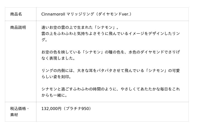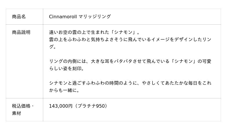【サンリオキャラクターズ】シナモロール。「シナモン」が雲の上をふわふわと飛んでいるイメージのマリッジリング(結婚指輪)2デザイン。7月22日(火)発売