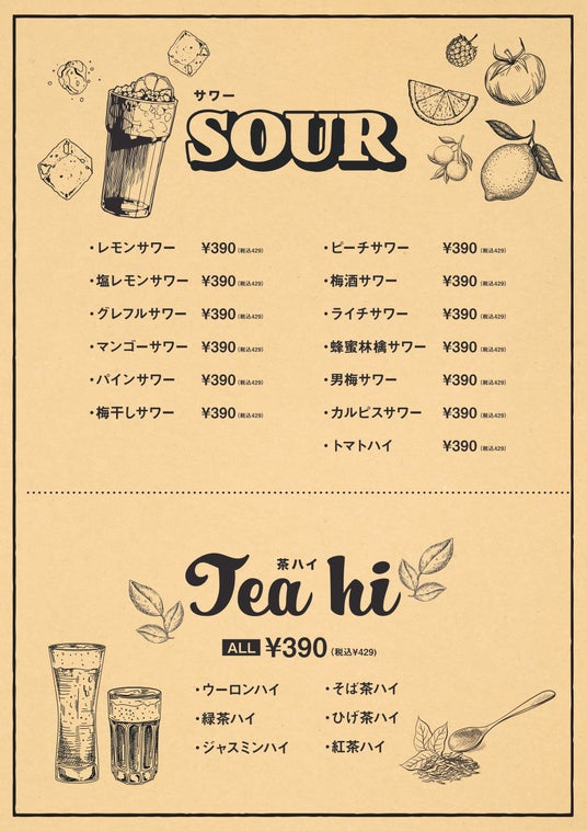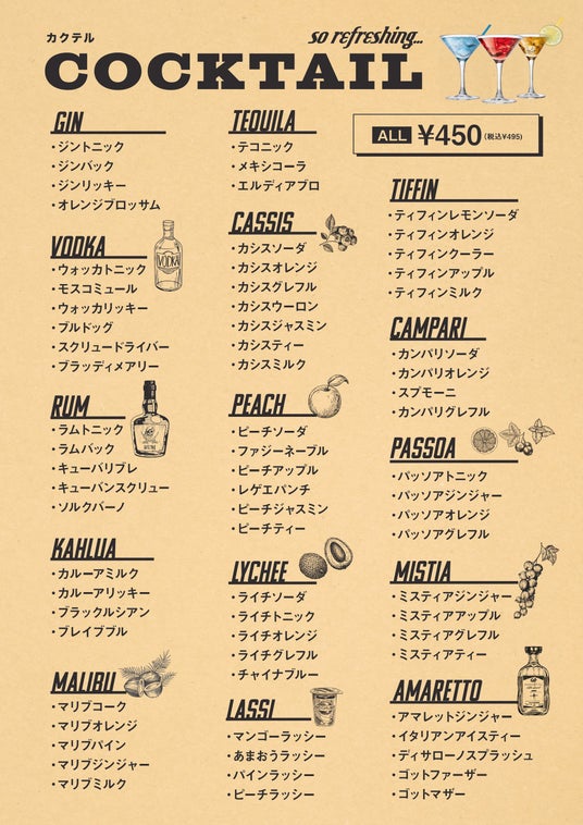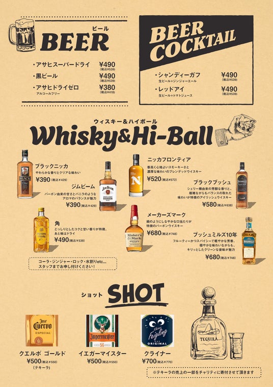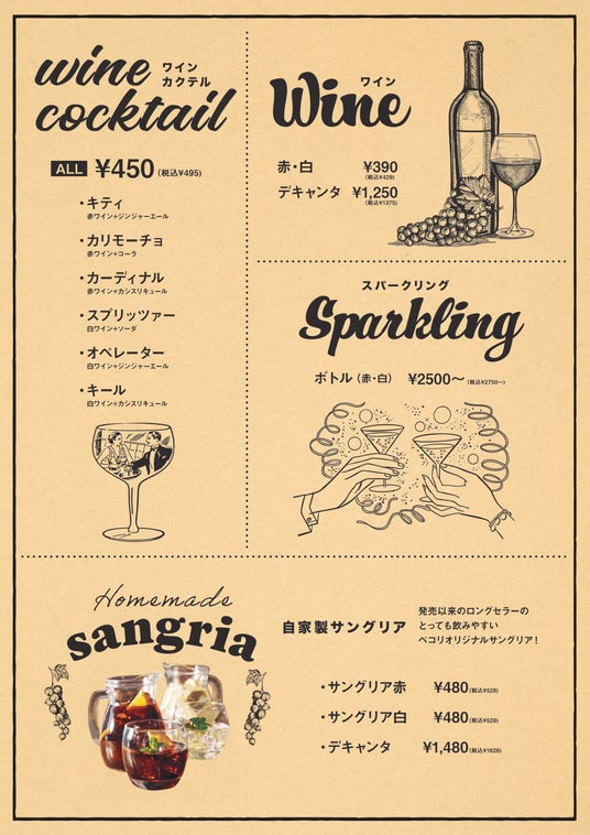 ドリンクメニューはビールや各種ウイスキー、サワー、カクテルはもちろん、料理に合わせて楽しめるワインや自家製サングリアなど幅広いドリンクメニューは一杯390円(税抜)~。