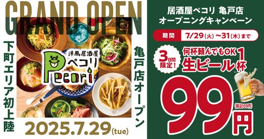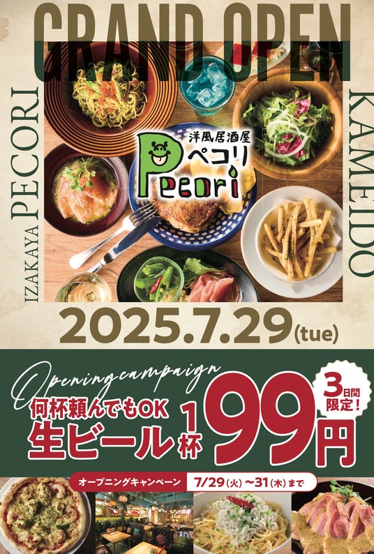 「洋風居酒屋Pecori(ペコリ)」が東京下町エリアに初上陸!亀戸店オープンを記念して7月29・30・31日の3日間は生ビール99円!
