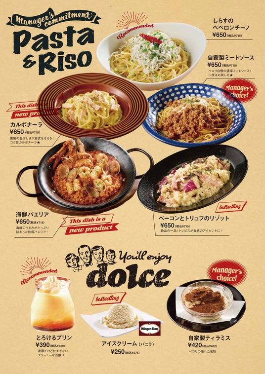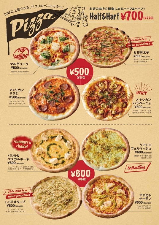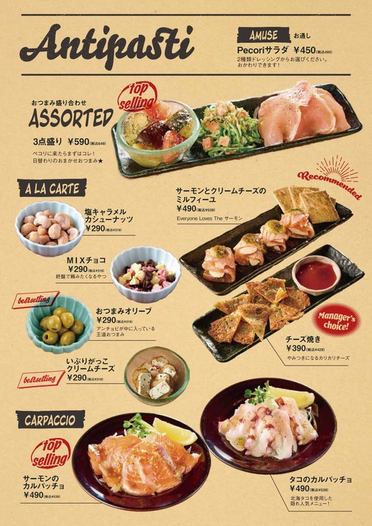 本格的な手づくり洋食をリーズナブルな値段で小皿サイズから楽しめるのがPecoriの魅力。手づくりピザは500円(税抜)、日替わりの種類豊富なタパスも一品290円(税抜)から提供。常設メニューに加えて旬のものを取り入れた季節のメニューもあり、様々な食材を飽きなくお楽しみいただけます。