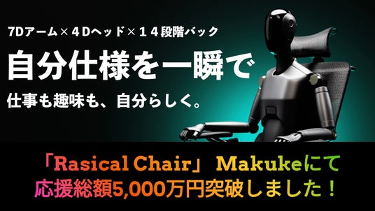 Rasical Japan(ラシカルジャパン)合同会社(本社:京都市下京区、代表社員:眞田 到) は、クラウドファンディングサイト「Makuake」にて開始した「Rasical Chair」が5,000万円を突破しました。