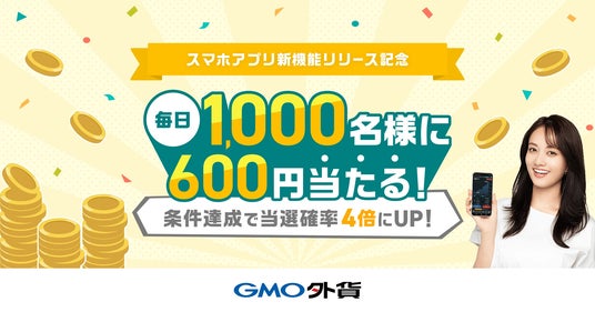 外貨exアプリの新機能リリースを記念して、毎日1,000名様に600円をプレゼントするキャンペーンを開催いたします。