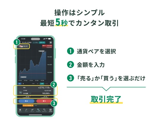 1. 通貨ペアを選択 →2. 金額を入力 → 3.「売る」か「買う」を選ぶだけで取引が完了。
