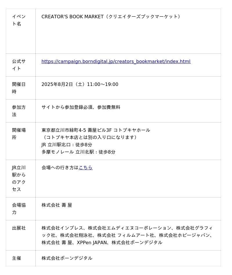 株式会社ボーンデジタル(本社:東京都千代田区、CEO:新 和也、URL:https://www.borndigital.co.jp)は、『CREATOR'S BOOK MARKET』を2025年8月2日(土)に開催いたします。