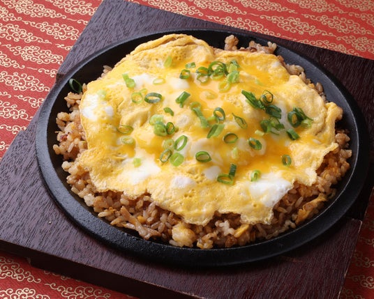 鉄板で炒めた炒飯を、香ばしい黒醤油で味付けし、薄焼き玉子をのせました。