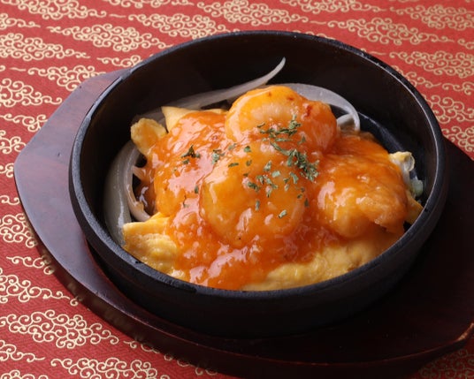 海老のプリプリ、玉子のふわふわ、まろやかに仕上げた自家製チリソースを熱々の鉄板でご賞味あれ!