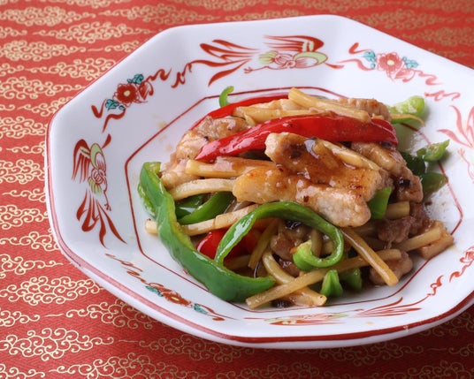 もち豚・たけのこ・ピーマンを青椒肉絲風に鉄板で焼き上げる一皿です。