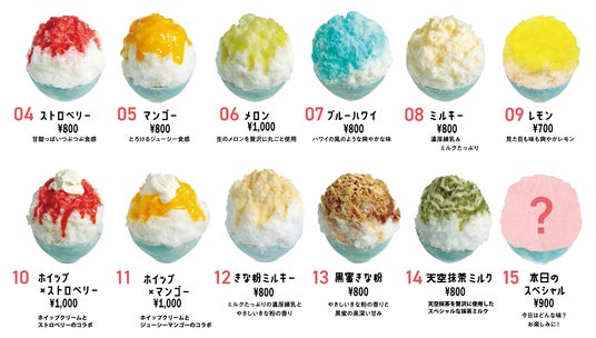 他にも、気分に合わせて選べるフレーバーが登場。暑い夏のお供に、蓼科高原の天然氷を使ったふわふわのかき氷をお楽しみください。