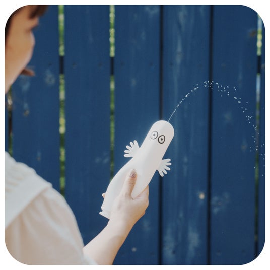 底のふたを外して水を入れ、押し出すと、ニョロニョロの頭上から水が勢いよく噴き出す、楽しい仕掛け付きです。