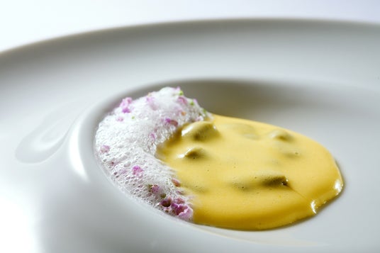 南部地方の郷土料理「いちご煮」を再構築した一皿です。出汁の旨みをまとった鮑の生地を、とろけるような生雲丹と芳醇なソースとともに味わえます。「乳白色の汁に浮かぶウニが、朝靄に霞む野いちごのように見えた」という料理名の由来に情景を重ね、日本酒の泡と花穂紫蘇で、朝靄と野に咲く花を表現しています。青森で育まれた食材と食文化が紡ぐ物語を感じられる一皿です。