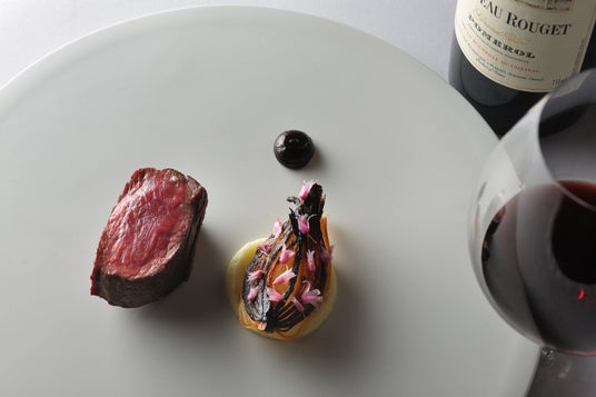 薫香を纏った熟成牛に合わせるのは、ブラックチェリーを思わせる香りと、しなやかなタンニンが特徴のシャトー・ルジェ 2013です。メルローの果実味が新玉ねぎのやさしい甘みと響き合い、黒ニンニクの深いコクと重なることで、味わいに奥行きが生まれます。ハーブの青い香りが酸を引き立て、力強さと繊細さが調和するペアリングです。