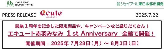 株式会社ジェイアール東日本都市開発が運営するエキナカ商業施設 エキュート赤羽では、エキュート赤羽の南ゾーンとして昨年7月に誕生した「エキュート赤羽みなみ」の開業1周年を記念し、2025年7月28日(月)から8月3日(日)まで、エキュート赤羽全館で「エキュート赤羽みなみ 1st Anniversaryフェア」を開催いたします。期間中は、開業1周年を記念した限定商品やキャンペーンなどをご用意し、