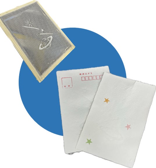 紙のつくり方、仕組みを学ぶことができます。種類が豊富な透かし模様のすき枠や色んなかたちに切りぬいた色紙を飾り付けて、世界に1つだけのオリジナルのはがきをつくってみてはいかがでしょうか。