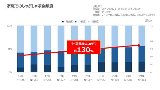 近年の暖冬の影響で鍋料理の登場頻度が減少する中でも、「しゃぶしゃぶ」は秋冬の外せない定番メニューとなっており、家庭でのしゃぶしゃぶ食頻度では中・高頻度層が15年度と比べ134%と増加傾向にあります。その理由としては、外食店の人気からしゃぶしゃぶの関心が高まっていること、そして自分好みにたれやだしを選べることが魅力となっているため、今後も様々な素材や食べ方で楽しむ方が増えると予想されます。