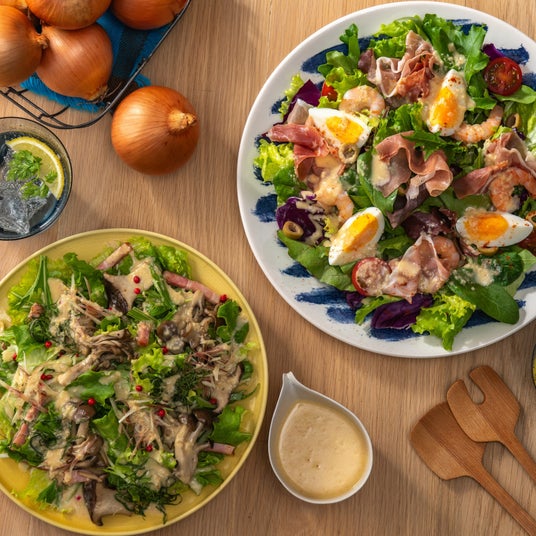 左きのことベーコンのシェフズオニオンサラダ 右生ハムとゆで卵のシェフズオニオンサラダ