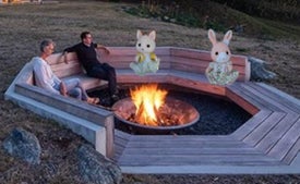 直径3mのベンチ付きファイヤーピットでは、シルバニアビレッジオリジナルキャラクター「ののはなウサギの女の子」と「そよかぜネコの女の子」のプロップスを設置しています。テーマコテージご利用のお客様だけが楽しめるフォトスポットや憩いの場として、キャンプのひとときをゆったりとお過ごしいただけます。
