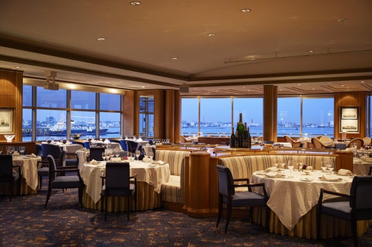 実在したフランスの豪華客船ノルマンディー号をコンセプトにした店内からは、横浜港の景色を一望いただけます。ランチタイムでは、青い海と空や銀杏並木の黄葉とともに、景色に包まれているかのような優雅なお食事のひとときをお楽しみください。