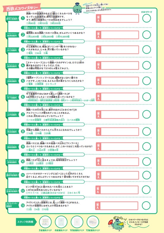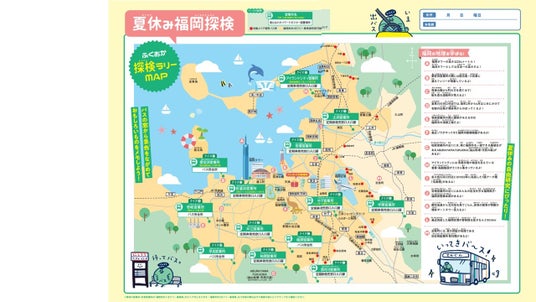探検ラリー台紙には、西鉄バスに関するクイズや、福岡市周辺の地理情報が載っている「ふくおか探検ラリーマップ」など、楽しく学べる情報を満載しており、夏休みの自由研究にもご活用いただけます。