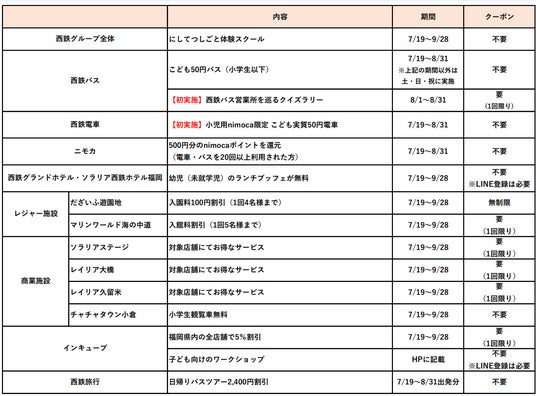 西鉄グループでは、7月19日(土)から9月28日(日)までの期間中、「にしてつキッズフェア」と称して当社グループ全体でお子さま向けのイベントやサービスを実施しています。バス部門では、探検ラリーのほか、夏休み期間中(7/19~8/31)は、小学生以下のお子さまを対象に、一般路線バスの運賃をどこまで乗っても1乗車50円とする「こども50円バス」も実施中です。これらの取組みが次世代を担う子どもたちの成長に貢献できればと考えております。