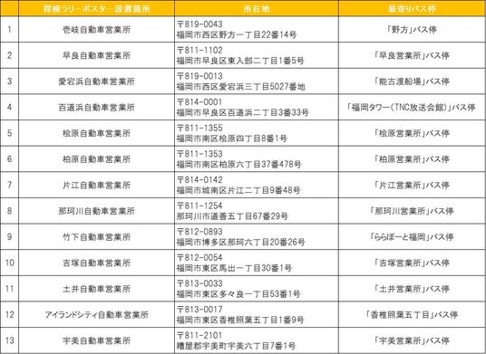 西鉄バス営業所(13営業所)、西鉄天神高速バスターミナル、西鉄インフォメーションセンター(天神)、福岡市内の西鉄バス定期券発売窓口、博多バスターミナル等