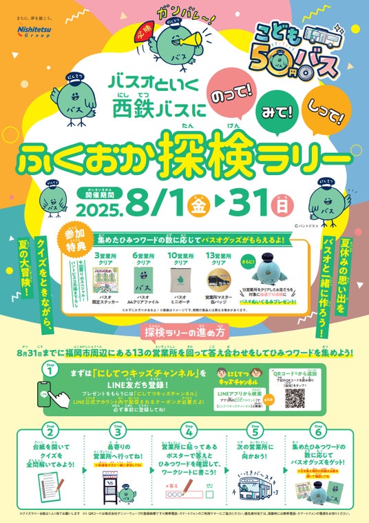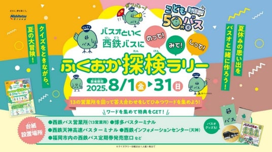 西日本鉄道(株)では、2025年8月1日(金)から8月31日(日)までの期間中、にしてつキッズフェアの一環として『西鉄バスにのって!みて!しって!ふくおか探検ラリー(以下、探検ラリー)』を実施いたします。