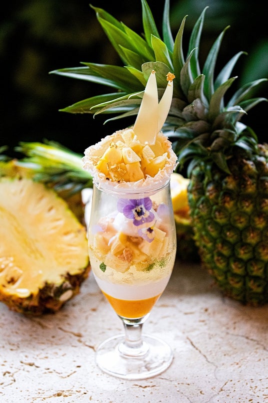 トップ部分には「ゴールドバレル」の美味しさをダイレクトに味わっていただけるよう、ダイスカットをしたフレッシュなゴールドバレルをふんだんに盛り付けました。そのサイドには、ゴールドバレルの果肉をたっぷりと使った自家製のパインソルベを添え、涼やかな印象に。
