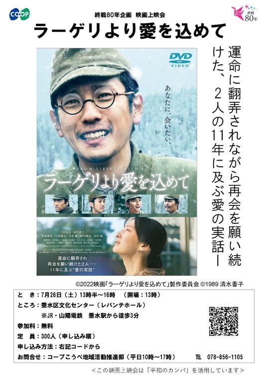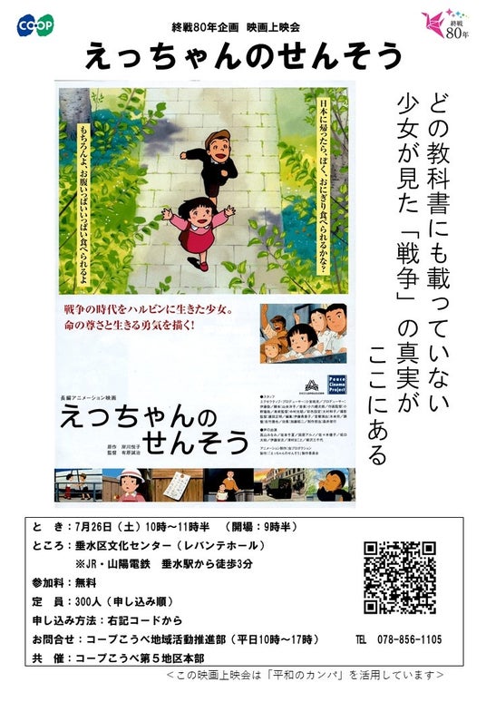 まず、さまざまな年代の方々が「平和」について考え、その思いを馳せるきっかけとして、1年を通じて映画上映会を開催いたします。上映作品は、地域の組合員からなる「平和企画の会」のメンバーが、「ぜひ見てほしい」と思う映画をリストアップしました。第1回目となる映画上映会が7月26日(土)にレバンテホール(神戸市立垂水区文化センター)で行いますので是非、ご来場ください。