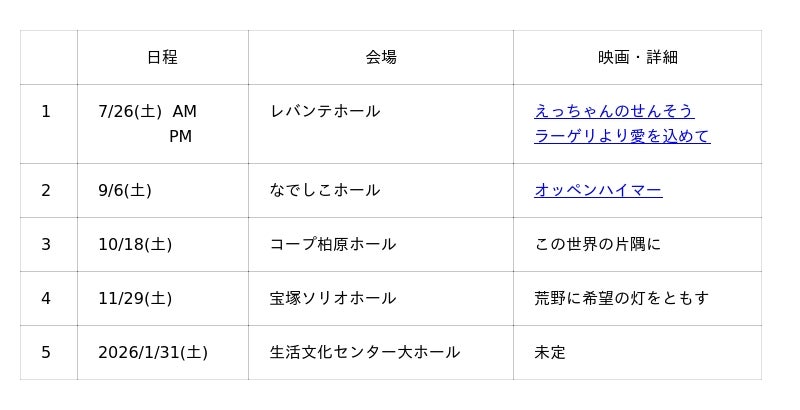 終戦80年を機に、争いごとが無い平和な社会を次世代に残すため、「平和映画上映会(全5回)」を開催します。