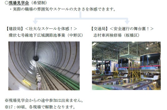 管理職による講演、若手職員との座談会、現場の見学会を通じて、技術職員が仕事の魅力やダイナミックな現場を紹介します。動きやすい服装で、お気軽にご参加ください!