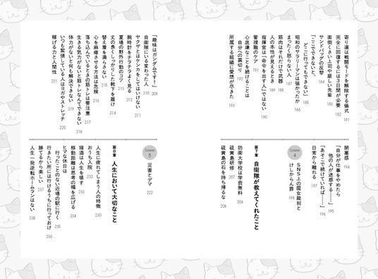 本書では、Xで評判になった投稿や、コラムとして自衛官時代の経験やインフルエンサーとしての体験から学んだ、ストレスからメンタルを守るための知恵をお伝えします。不安になったときの対処法、人間関係での敵味方の見極め方、他人からの「マウント」に惑わされない思考法、SNSの炎上から身を守る方法、 そして災害時のデマとの向き合い方。これらはすべて、現代社会を生きる私たちが直面する現実的な問題だからです。この本は、答えを教える本ではありません。むしろ、一緒に考える本です。私の体験談や失敗談を通して、「あ、そういう見方もあるのか」と思ってもらえれば十分です。そして、読み終わった後に、少しだけ肩の力が抜けて、「まあ、なんとかなるか」と思えるようになっていたら、それ以上に嬉しいことはありません。 情報に振り回されず、でも孤立もせず、適度な距離感で現代社会と付き合って いく。そんな生き方のヒントが、この本の中に見つかることを願っています。
