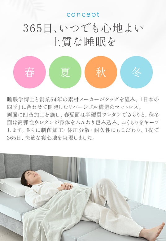 「四季にフィットする眠り」をコンセプトに誕生した、ウレタン素材の専門メーカーが手がける寝具ブランド。高性能な素材選定と日本の気候や生活習慣に合わせた構造で、365日快適な眠りを目指しています。