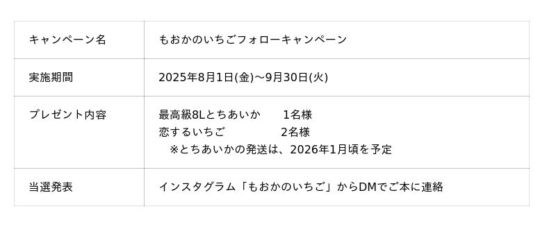 「もおかのいちご」フォローキャンペーン告知投稿の画像