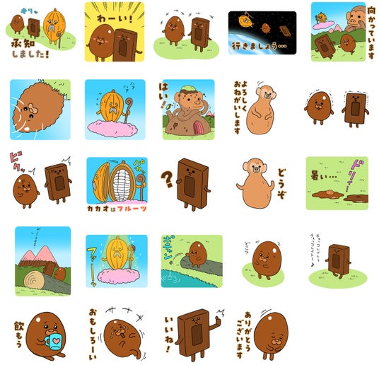 書籍『おいしいをつくる チョコレートのおしごと事典』のキューライスのイラストがスタンプになりました。チョコレートと仲間たちが、あなたの気持ちをゆるっと伝えます。