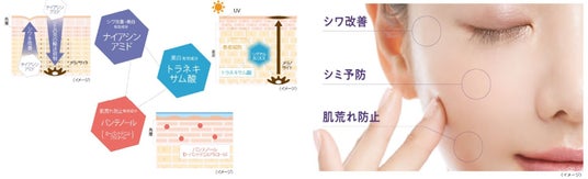 *¹ 3つの有効成分「ナイアシンアミド」、「トラネキサム酸」「D-パントテニルアルコール」を配合したシワ改善有効成分配合の医薬部外品として日本初。
