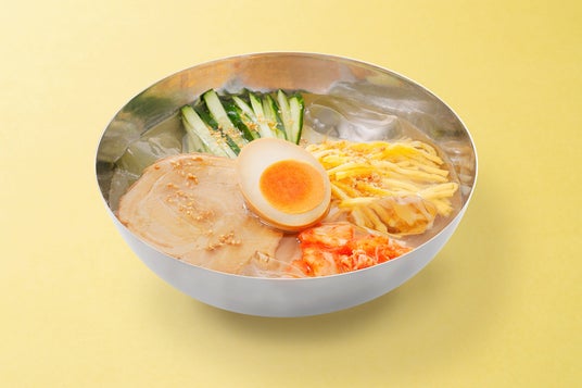 五目冷麺は、のどごしの良い盛岡冷麺を使用した、涼やかな一杯。塩味ベースのスープに、本場韓国の家庭の味"牛肉ダシダ"を加え、コクと旨みを引き出しました。さらに、りんご果汁の自然な甘みとほどよい酸味がアクセントに。後味はさっぱりで、暑い季節にもぴったりの冷麺です。