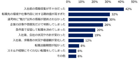 入社後ギャップが生じる原因を質問すると、上位は「入社前の情報収集が不十分だった」(42%)、「転職先の環境や仕事内容に対する期待値が高すぎた」(32%)、「選考時に"魅力"以外の情報が提供されなかった」(30%)でした。入社後ギャップを防ぐためには、求職者が自発的に情報を収集することに加え、企業がアピールポイント以外の情報を適切に開示することの必要性がうかがえます。