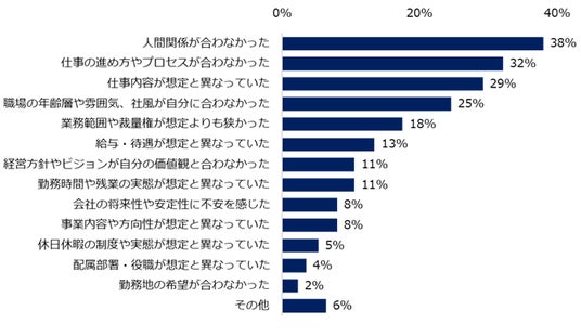 どのようなギャップを感じている方が多いかを伺うと、上位は「人間関係が合わなかった」(38%)、「仕事の進め方やプロセスが合わなかった」(32%)、「仕事内容が想定と異なっていた」(29%)でした。