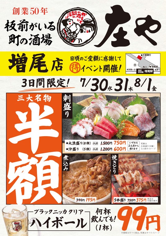 また、期間中はずっと「ハイボール(ブラックニッカクリア)」が何杯飲んでも1杯99円です。このお得な機会に、地域の方々に親しまれてきた『庄や』増尾店にて、板前が腕を振るう自慢の料理を存分に楽しんでください。