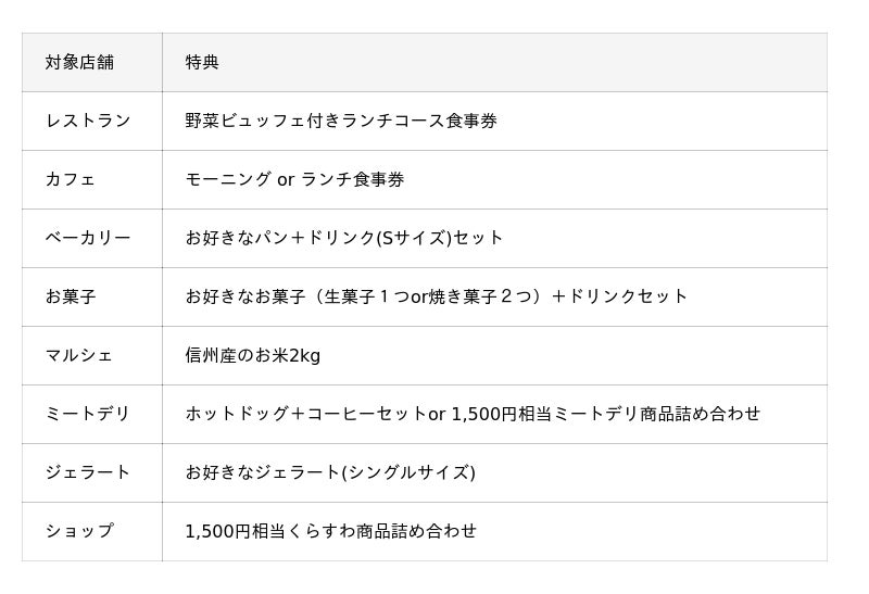 「くらすわ」全店(くらすわの森、くらすわ諏訪本店、和ダイニングくらすわ信毎メディアガーデン松本店、くらすわショップMIDORI長野店、くらすわ東京スカイツリータウン・ソラマチ店、くらすわ 渋谷ヒカリエ ShinQs店、くらすわベーカリー新宿タカシマヤ店、くらすわベーカリー 神保町店)