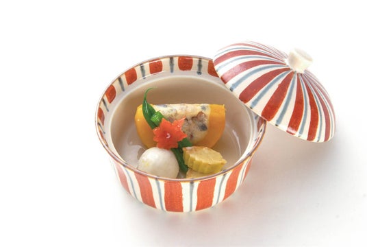 ・皮を剥いた南瓜を半分に割り、中に豆腐や卵、三重県でも有名な鰻を射込んだ煮物は、断面の美しさにもこだわって調理します。タレ焼きにした鰻をカットして 15 分くらい蒸し、南瓜に射込むのでより柔らかくなり、素材の魅力を最大限に引き出せるようこだわっています。